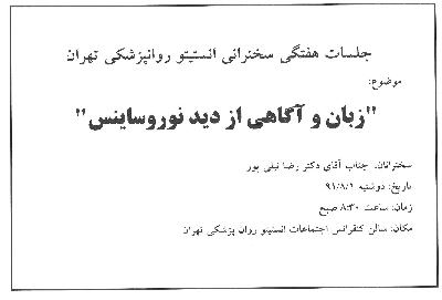 اخبار > جلسه این هفته سخنرانی انستیتو روانپزشکی تهران با موضوع "زبان و آگاهی از دید نوروساینس" با سخنرانی دکتر رضا نیلی پور برگزار می شود.
