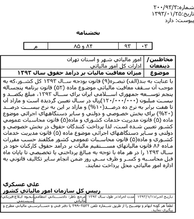 اخبار > بخشنامه جدید اعمال معافیت های مالیاتی حقوق کارکنان در سال 93