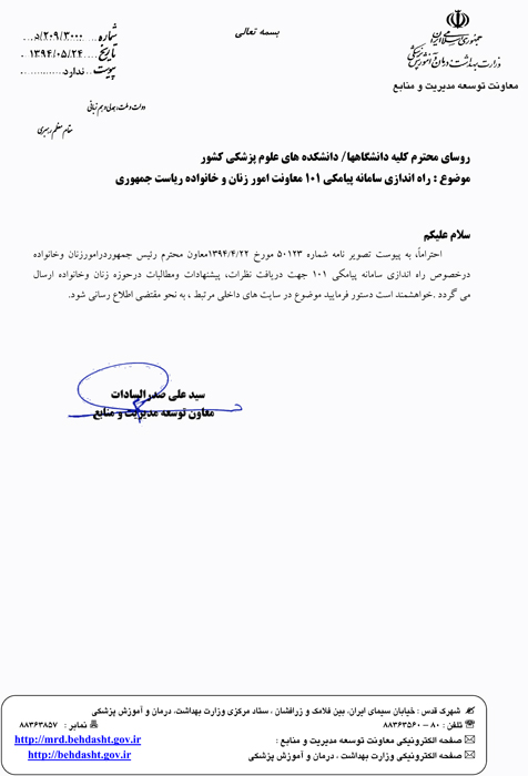 اخبار > راه اندازی سامانه پیامکی 101 معاونت امور زنان و خانواده ریاست جمهوری
